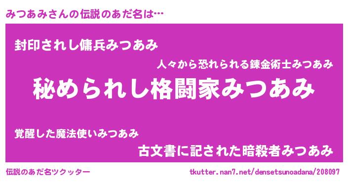 | ヒーロー風カッコイイあだ名 | 『仮面ミツダー』『ウルトラみつあみマン』 |