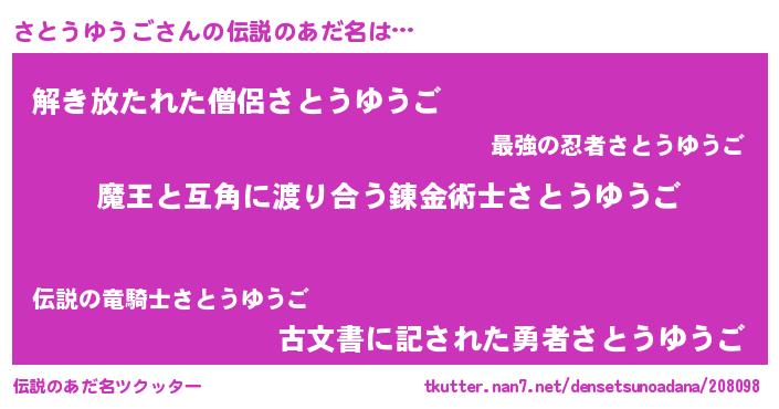 | ヒーロー風カッコイイあだ名 | 『愛の使者さとうゆうご』『天弓騎士サト』 |