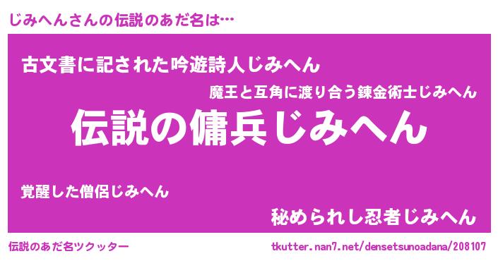 | 男性向けラノベタイトル風あだ名 | 『じみへんの憂鬱』『魔弾の王とじみへん』 |