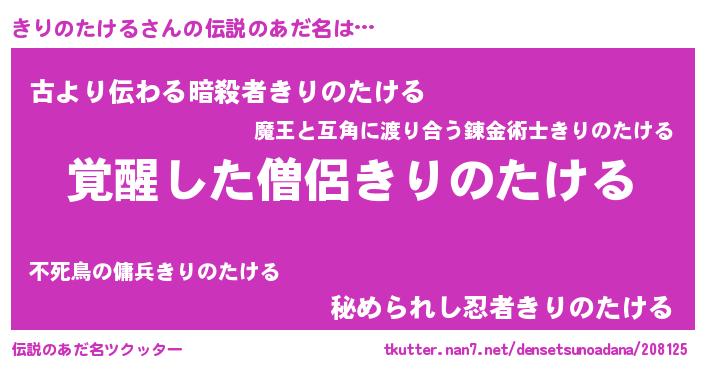 | 女子向けラノベタイトル風あだ名 | 『きりのたける様がみてる』 |