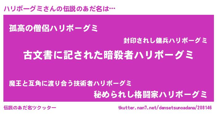 | 男性向けラノベタイトル風あだ名 | 『Re:ハリボーグミから始める異世界生活』 |