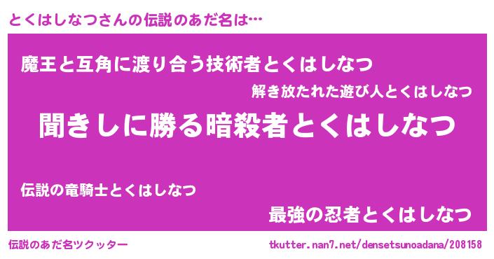 | 肩書あだ名 | 『とくはしなつ閣下』『とくはしなつ先生』 |