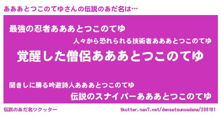 | 男性向けラノベタイトル風あだ名 | 『あああとつこのてゆの嫁は女の子じゃないと思った?』 |