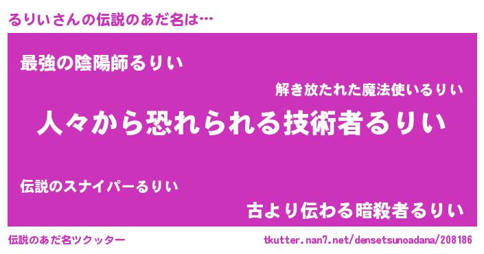 | 男性向けラノベタイトル風あだ名 | 『ルリイスレイヤー』『魔弾の王とるりい』 |