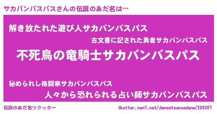 | 男性向けラノベタイトル風あだ名 | 『サカバンバスパスに滅ぼされるだけの簡単なお仕事です』 |