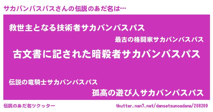 | 男性向けラノベタイトル風あだ名 | 『サカバンバスパスに滅ぼされるだけの簡単なお仕事です』 |