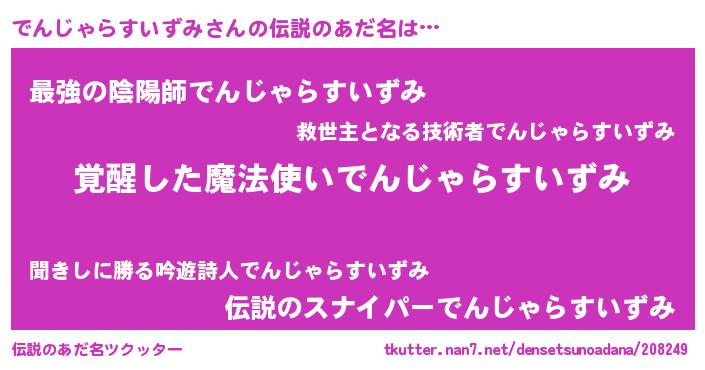 | 男性向けラノベタイトル風あだ名 | 『でんじゃらすいずみ~年齢イコール彼女いない歴の魔法使い~』 |