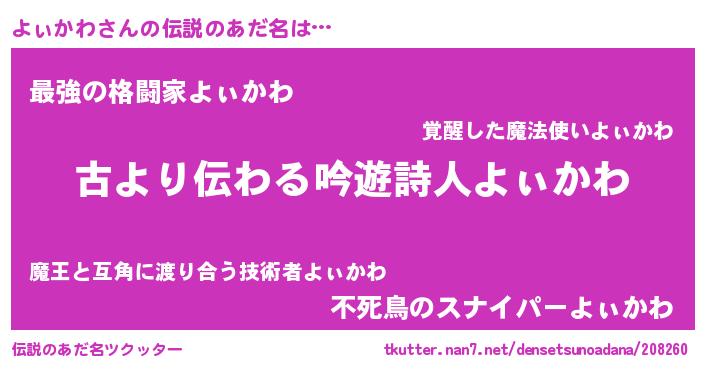 | 意味不明あだ名 | 『永久保存よぃかわ』『自称よぃかわ』 |