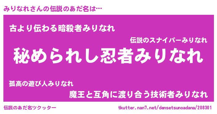 | 意味不明あだ名 | 『住所不定無職みりなれ(56歳)』 |