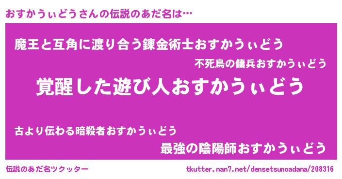 | 男性向けラノベタイトル風あだ名 | 『この素晴らしい世界におすかうぃどうを!』 |