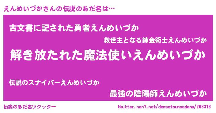| ヒーロー風カッコイイあだ名 | 『魔戒騎士エン』『ネオエンメイヅカ』 |
