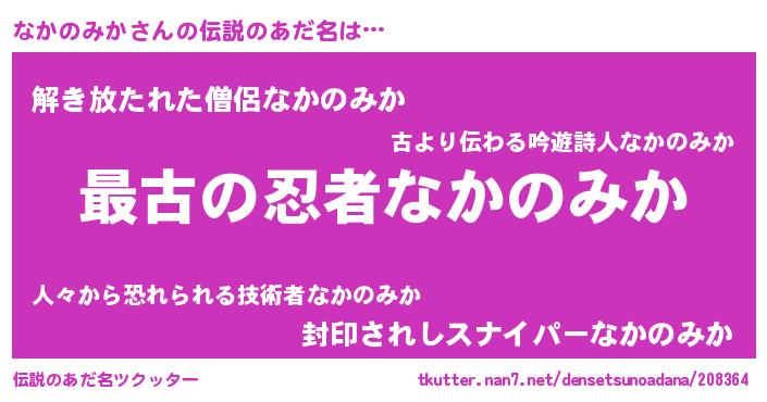 | 女子向けラノベタイトル風あだ名 | 『乙女ゲームの破滅フラグしかない悪役なかのみかに転生してしまった…』 |