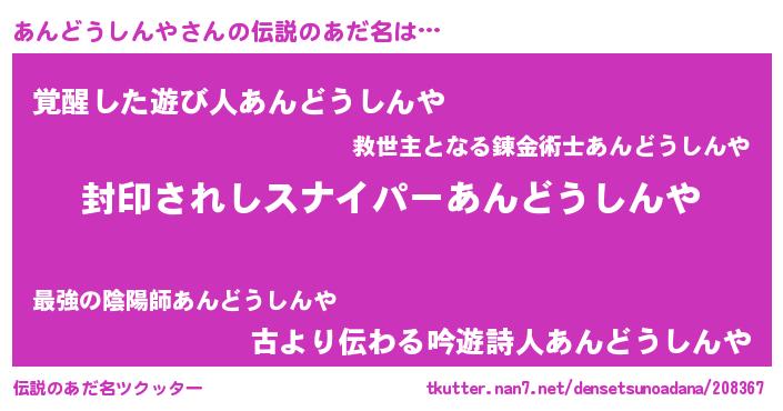 | 胡散臭い通販商品みたいなあだ名 | 『億万長者になれる霊験あらたかなお札…その名も「あんどうしんや」』 |