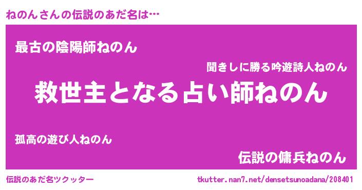 | 男性向けラノベタイトル風あだ名 | 『Re:ねのんから始める異世界生活』 |