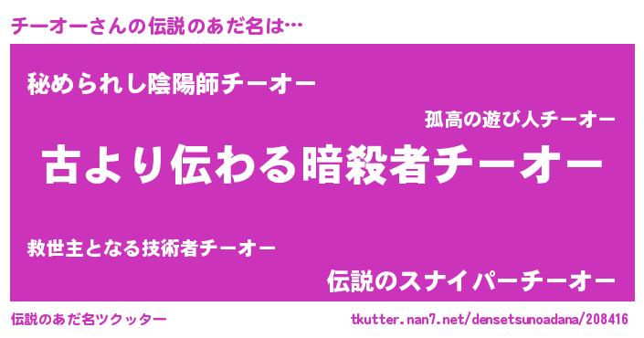| 意味不明あだ名 | 『永久保存チーオー』『ペロリンチーオー』 |