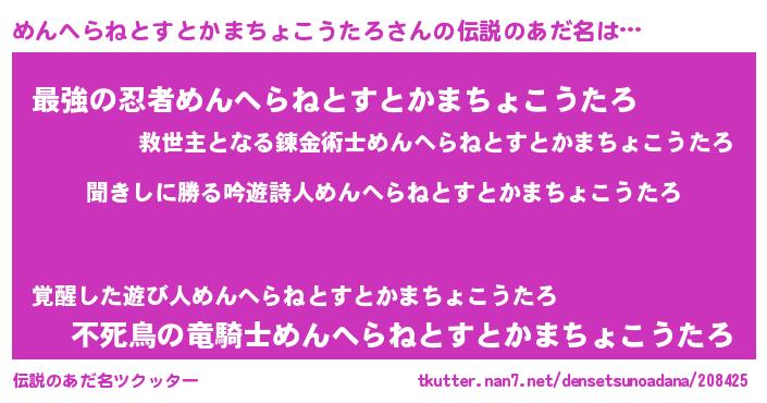 | 胡散臭い通販商品みたいなあだ名 | 『ガンによく効く高麗人参…その名も「めんへらねとすとかまちょこうたろ」』 |