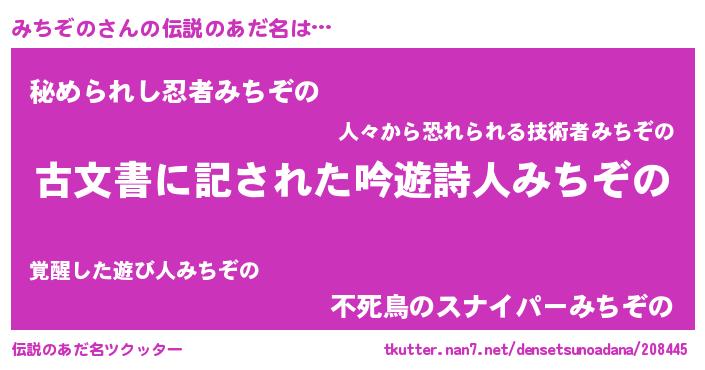 | 男性向けラノベタイトル風あだ名 | 『みちぞの~年齢イコール彼女いない歴の魔法使い~』 |