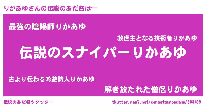 | 胡散臭い通販商品みたいなあだ名 | 『必ず成功する霊験あらたかなお札…その名も「りかあゆ」』 |