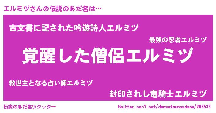 | 男性向けラノベタイトル風あだ名 | 『エルミヅ~年齢イコール彼女いない歴の魔法使い~』 |
