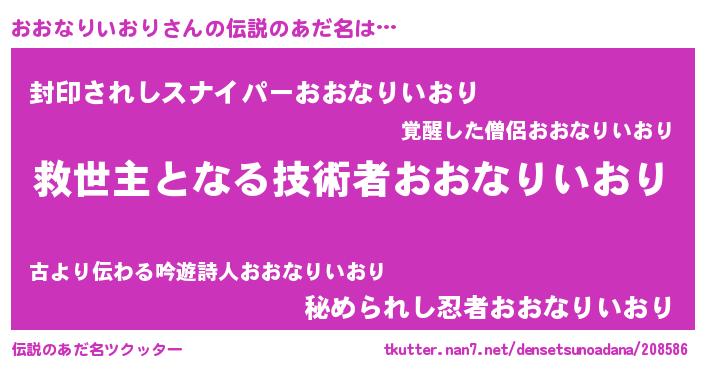 | 男性向けラノベタイトル風あだ名 | 『おおなりいおり~年齢イコール彼女いない歴の魔法使い~』 |