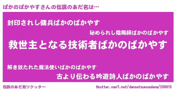 | 男性向けラノベタイトル風あだ名 | 『この素晴らしい世界にばかのばかやすを!』 |