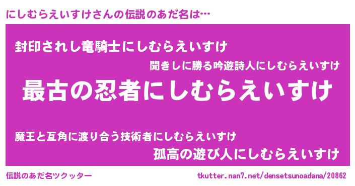 | 男性向けラノベタイトル風あだ名 | 『やはりにしむらえいすけの青春ラブコメはまちがっている 』 |