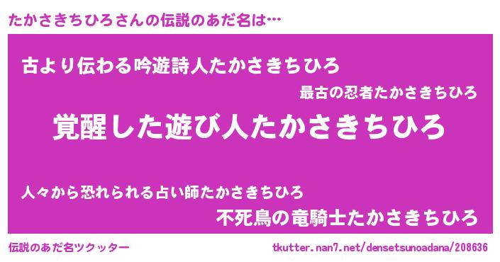 | ヒーロー風カッコイイあだ名 | 『天弓騎士タカ』『ネオタカサキチヒロ』 |