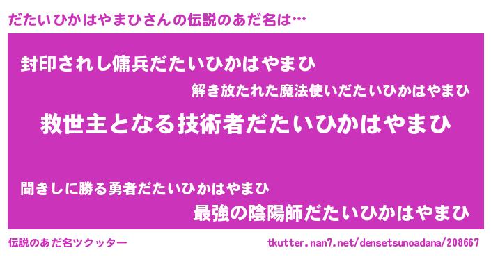 | 男性向けラノベタイトル風あだ名 | 『うちのだたいひかはやまひが世界を掌握している!』 |