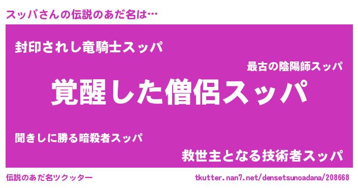 | 男性向けラノベタイトル風あだ名 | 『スッパに滅ぼされるだけの簡単なお仕事です』 |