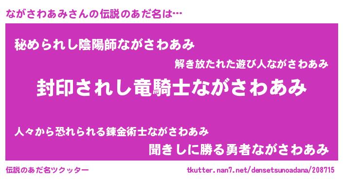| 男性向けラノベタイトル風あだ名 | 『ながさわあみ~年齢イコール彼女いない歴の魔法使い~』 |