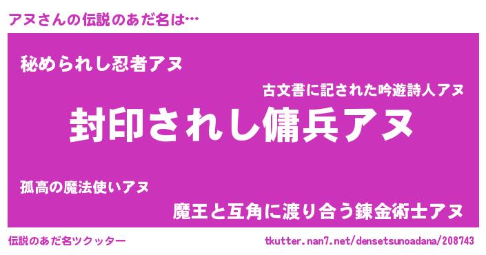 | 男性向けラノベタイトル風あだ名 | 『アヌアートオンライン』 |