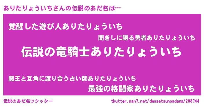 | 男性向けラノベタイトル風あだ名 | 『アリタリョウイチスレイヤー』 |