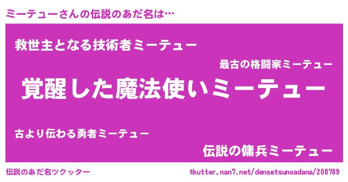 | 男性向けラノベタイトル風あだ名 | 『ミーテューの嫁は女の子じゃないと思った?』 |