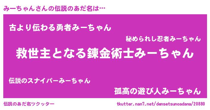 | 男性向けラノベタイトル風あだ名 | 『Re:みーちゃんから始める異世界生活』 |