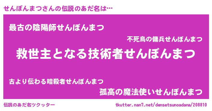 | 男性向けラノベタイトル風あだ名 | 『せんぼんまつに滅ぼされるだけの簡単なお仕事です』 |