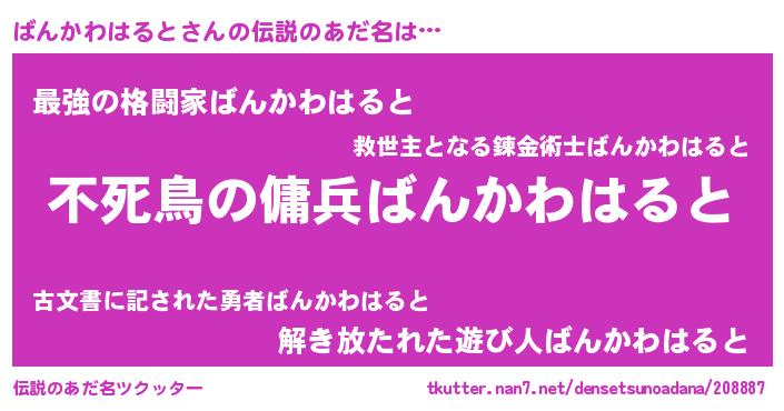 | 男性向けラノベタイトル風あだ名 | 『ばんかわはるとの憂鬱』 |