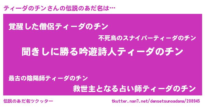 | 男性向けラノベタイトル風あだ名 | 『ティーダのチンという概念が存在しない退屈な世界 』 |