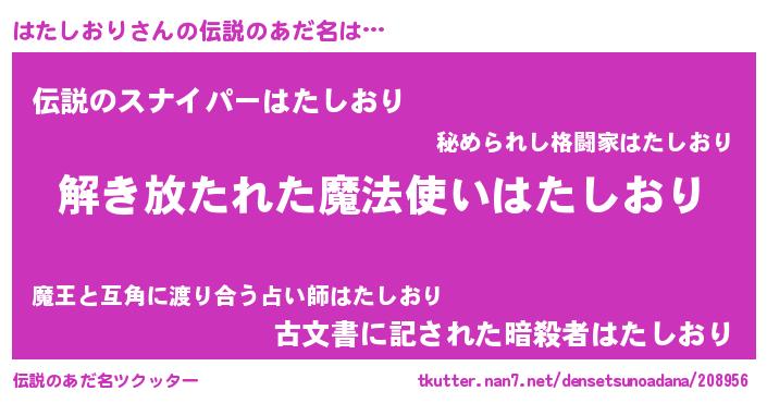 | 男性向けラノベタイトル風あだ名 | 『はたしおりの嫁は女の子じゃないと思った?』 |