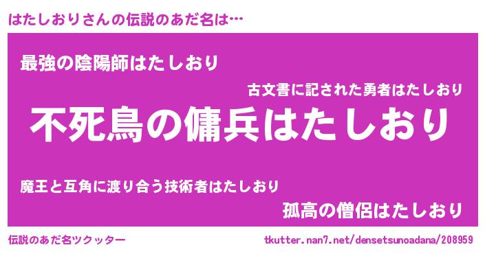| 男性向けラノベタイトル風あだ名 | 『ハタシオリアートオンライン』 |