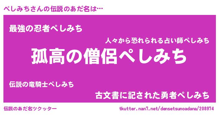 | ヒーロー風カッコイイあだ名 | 『黄金騎士ペシ』『ウルトラぺしみちマン』 |