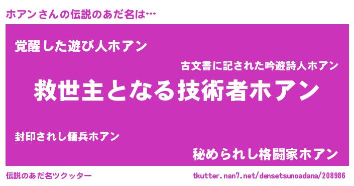 | ヒーロー風カッコイイあだ名 | 『天空の使者ホアン』『炎刃騎士ホア』 |