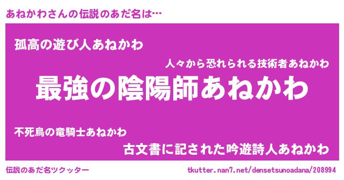 | 肩書あだ名 | 『あねかわ国家主席』『あねかわリーダー』 |