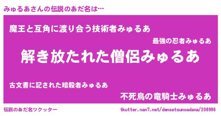 | 男性向けラノベタイトル風あだ名 | 『ダンジョンにみゅるあを求めるのは間違っているだろうか』 |