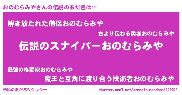 | ヒーロー風カッコイイあだ名 | 『仮面オノダー』『スーパーオノムラミヤ』 |