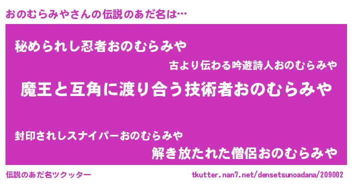 | ヒーロー風カッコイイあだ名 | 『愛の使者おのむらみや』『魔戒騎士オノ』 |