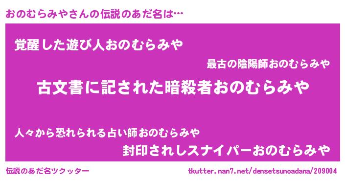 | ヒーロー風カッコイイあだ名 | 『ネオオノムラミヤ』『炎刃騎士オノ』 |