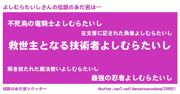 | 男性向けラノベタイトル風あだ名 | 『ノーゲーム・ノーヨシムラタイシ』 |