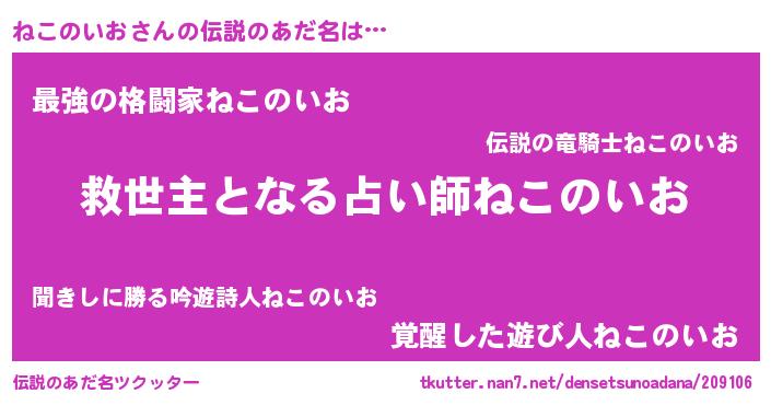| 女子向けラノベタイトル風あだ名 | 『死神ねこのいおの再婚』 |