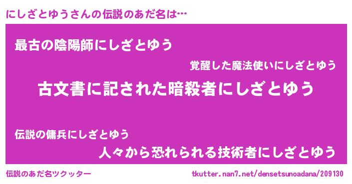 | ヒーロー風カッコイイあだ名 | 『ネオニシザトユウ』『黄金騎士ニシ』 |