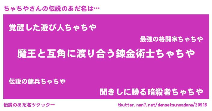 | 男性向けラノベタイトル風あだ名 | 『転生したらちゃちやだった件』 |